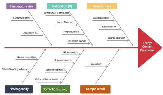 The following uncertainty consideration can help to unify the procedure of determining the uncertainty of a calorific value measured by bomb calorimetry. With this a better estimate about the accuracy of calorific values is accessible. The term uncertainty is defined as a margin of error or dispersions attributed to any measured quantity [29]. To estimate the total uncertainty of the calorific value, all the variables that are part of Equations (1)–(3) (see Section 2.4) must be highlighted and investigated for their individual uncertainty. Therefore, each uncertainty source was defined and its contribution was calculated in this work. Each of these sources may have an impact on the final calorific value. Figure 7 provides an Ishikawa diagram that shows different uncertainty sources associated with the overall uncertainty of the final calorific value.