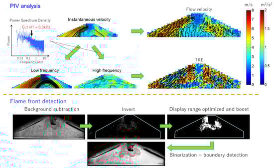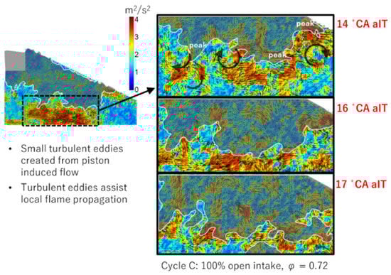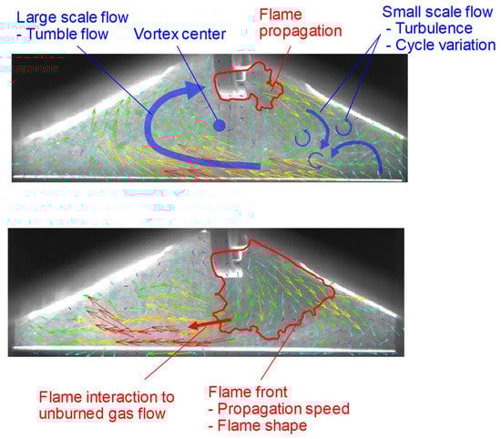 - Le, M.K.; Furui, T.; Nishiyama, A.; Ikeda, Y. The Interaction of Flow-Field and Turbulence on Flame Development using High-Speed Combustion PIV. In Proceedings of the 9th International Conference on Modeling and Diagnostics for Advanced Engine Systems, Okayama, Japan, 25–28 July 2017. [Google Scholar]