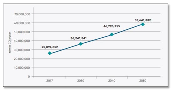 According to the Kuala Lumpur Climate Action Plan 2050 (2021), Kuala Lumpur’s annual carbon footprint was estimated to be 25 million metric tons in 2017. Transportation accounted for the most emissions, accounting for 56 percent of total emissions in the city. The GHG Emissions Inventory is a critical tool for quantifying and estimating carbon emissions, as well as tracking, reporting and evaluating a city’s progress on climate action. An updated inventory can notify Kuala Lumpur City Hall (DBKL), Malaysia, about the extent to which climate change mitigation initiatives and actions have resulted in actual GHG reductions or their equivalent in carbon emission reductions over time [14]. Meanwhile, without significant action by DBKL, it is estimated that Kuala Lumpur’s carbon emissions will more than double to 2.3 times their 2017 levels by 2050, as presented in Figure 3.