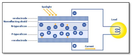 An experiment conducted by A.A. Bayod-Rujula (2019) presented how the PV conversion is based on the PV effect which is the conversion of light energy from the sun into electrical energy, as shown in Figure 4. PV cells are sun-exposed diodes with a wide surface area. An n-type layer is connected to a p-type layer to form a diode. The junction is the area where the two layers meet. Each region contains moving particles with different charges. Meanwhile, solar cells which are made of semiconductor materials and have an artificially created constant electric field through a p-n junction are used to carry out this conversion [28].