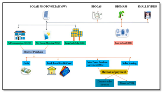 Lastly, M. Vaka et al. (2020) argued that the government launched a number of new initiatives and plans in response to the solar energy potential and, more broadly, renewable energy. Net Energy Metering (NEM), Feed-In Tariffs (FIT), Large-Scale Solar (LSS), Consumption (SELCO), and Renewable Energy (RE) incentives are just a few examples of programs aimed at reducing bills and fiscal burdens in the pursuit of a carbon-free environment. Malaysia’s government is concentrating its efforts on renewable energy and energy efficiency in order to reduce electricity bills and carbon dioxide (CO2) emissions. Indeed, Malaysian RE is a supporter of the ministry’s solar photovoltaic (PV) initiative to capture excess energy via the Net Energy Metering (NEM) program [37]. The Malaysian government has taken these initiatives and implemented numerous different programs to promote renewable and clean energy using the different technologies indicated in Figure 5.