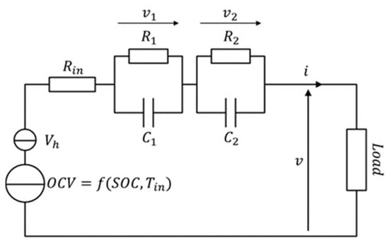The electric circuit model of the battery used in the temperature stress model is shown in Figure 1 Ref. [28]. The open circuit voltage (OCV) can be expressed as a function of the SOC and internal temperature of the battery. OCV, characteristically, rises during charging and falls during discharging, and this tendency varies according to SOC. The internal resistance can also be expressed as a function of SOC and temperature. The RC network located to the right of the internal resistance is a secondary model and represents the diffusion resistance and capacitance. and are related to the charge transfer processes occurring in the middle frequency range, whereas and are responsible for reproducing the diffusion processes. is an additional voltage component caused by the hysteresis characteristics of the RC network, which refers to the fluctuations on the open voltage during charge/discharge. This component is ignored, assuming its effect is relatively small. Moreover, the corresponding model for life-cycle cost analysis does not require detailed dynamic characteristics of the battery.