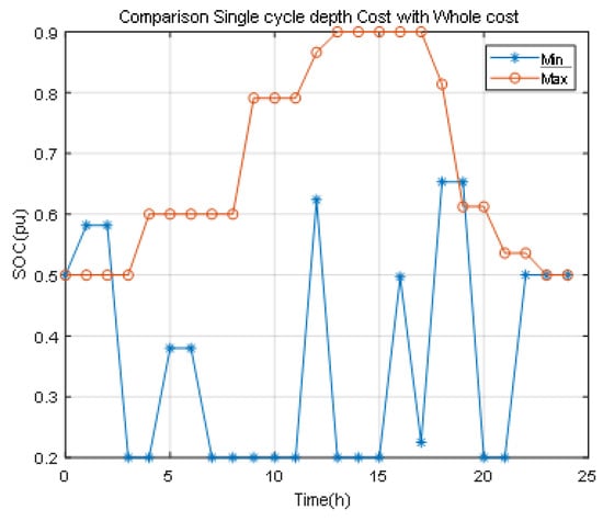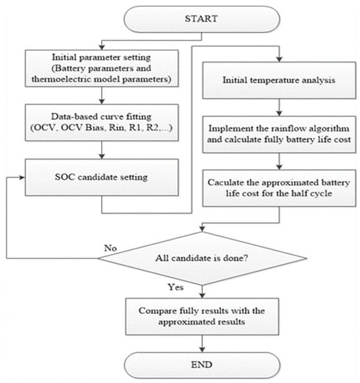 Figure 3 shows a flowchart depicting this process. Figure 4 shows the SOC graph where the difference between the two results is maximum and minimum when the life-cycle costs for the approximated and total cycle depths are calculated. As a result, when charging and discharging are repeatedly performed, the difference between the two life costs is small, as shown in the blue graph, whereas when charging and discharging are sequentially performed in one large cycle depth, the difference is the largest.