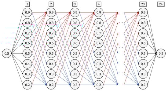 In (35), weights are applied to both the ESS life-cycle cost and system purchase cost to reflect the subjective preference of the ESS operator regarding the life-cycle cost. The larger this weight is, the larger the ESS life-cycle is, which is reduced when operating the ESS, whereas the system purchase cost is considered relatively low. Regarding this problem, the state and stage for the ESS SOC are defined as shown in Figure 6, and a reward table for state transition is constructed for reinforcement learning.