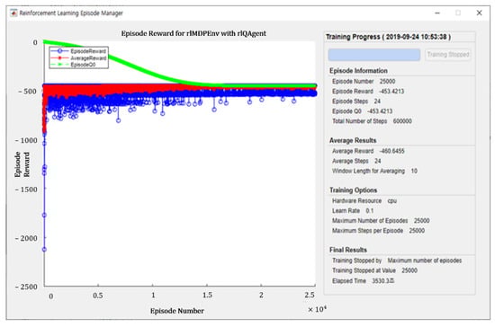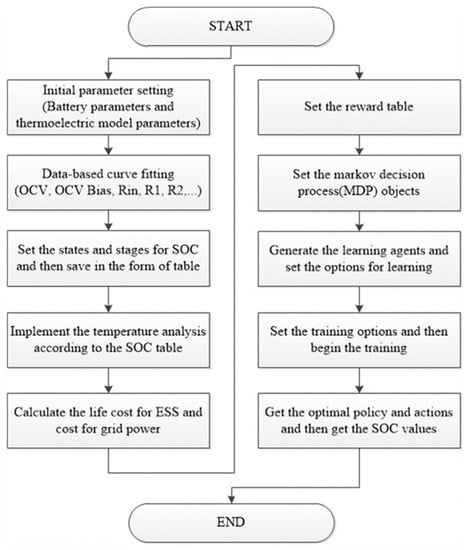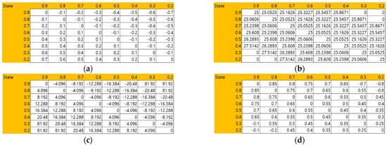 Figure 7 shows a flowchart for deriving a solution that applies reinforcement learning to the optimization problem considering the life-cycle cost of the ESS. Figure 8 and Figure 9 show examples of internal reward tables for reinforcement learning. Because this problem is a cost minimization problem, the cost value is treated with a negative sign.
