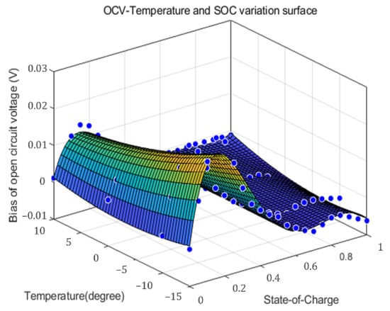 Regarding the effect of temperature on the OCV, Equation (8) shows the correlation between the OCV bias component and temperature. It can be expressed as a polynomial with the following related parameters in Table 2: