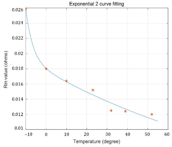The internal resistance is also configured as a function of the internal temperature and SOC, similar to the OCV. However, the internal resistance remains constant without significant changes over the general battery SOC usage period and is dominantly affected by the internal temperature Ref. [19]. Therefore, the internal resistance is expressed as a function of the internal temperature with the battery internal resistance curve parameters in Table 3 and formulated as follows: