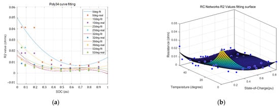 where is the sampling time, and is the discrete time index. The second network time constant does not change Ref. [28]; thus, what remains to be estimated are the resistance and time constant of the first RC network and the resistance of the second RC network. If and are known, then using the time constant relational expression () can be calculated, and can be calculated in a similar manner if and are known. Network resistances are based on a polynomial model, whereas the first time constant is based on an exponential equation. The equations are stated below and parameters are shown in Table 4, Table 5 and Table 6.