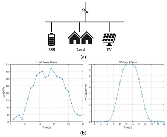 (a) The power system architecture; (b) The Load power curve and PV Output curve.