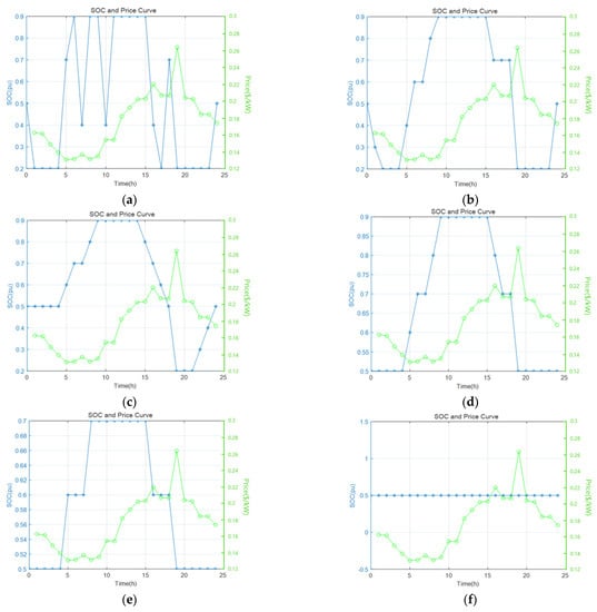 (a) SOC graph when life-cycle cost is not considered; (b) SOC graph when life-cycle cost weight is 0.1; (c) SOC graph when life-cycle cost weight is 0.4; (d) SOC graph when life-cycle cost weight is 0.5; (e) SOC graph when life-cycle cost weight is 0.6; (f) SOC graph when life-cycle cost weight is 0.8.