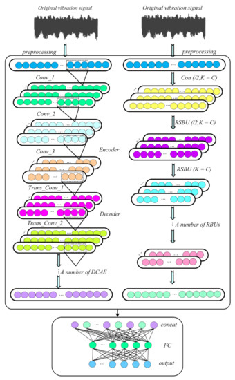 - In this study, the proposed improved DRSN–SDCAE model was divided into two parallel paths, as shown in Figure 6. In simple terms, the signals are delivered to the DRSN sub-path and the SDCAE sub-path, and feature learning is performed adaptively; then, the fault feature vectors of the two sub-paths are obtained through a feature fusion strategy to accurately identify the fault category of the waterproof valve. The specific steps are as follows. The original vibration signals in the experiment are collected by the vibration signal acquisition device and vibration signal sensor, and randomly divided into several samples. The training set and testing set are used to train the improved DRSN–SDCAE model and verify the correctness of the improved DRSN–SDCAE model, respectively;