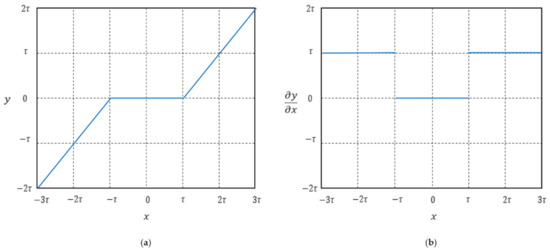 It can be seen from Equation (8) that the derivative of the soft threshold is either 1 or 0. The plotted image is shown in Figure 2b. This property is the same as the ReLU activation function. Therefore, soft thresholding can also reduce the risk of gradient disappearance and gradient explosion for deep learning algorithms. The soft thresholding function operates when both the threshold value is positive; the threshold value cannot be greater than the maximum value of the input signal.