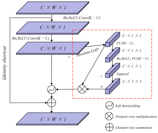 The residual shrinkage building units (RSBUs) are the evolution of RBUs in the residual network, which is the most important module of the DRSN, as shown in Figure 3. Here, the number of feature map channels is C, the width is W, and the height is 1, and there is a red sub-network on the residual module in Figure 3. This sub-network is called the threshold module, and its role is to set the threshold adaptively by learning the features of the samples.