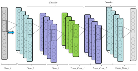 Compared with the conventional DAE, denoising convolutional autoencoder (DCAE) has the same basic structure of encoder and decoder, which is a fully connected DAE layer replaced by a convolutional layer. CNNs with a deep structure are easy to train; therefore, DCAE, as a type of CNN, can utilize the deep structure to improve the reconstruction ability. As shown in Figure 5, DCAEs consist of several convolutional and transposed convolutional layers, where the convolutional layer acts as an encoder and the transposed convolutional layer acts as a decoder. SDCAEs consist of multiple denoised convolutional autoencoders (DCAEs) by superposition. SDCAEs are capable of extensive and powerful fault feature extraction from a large amount of noise-laden vibration data in the original input.