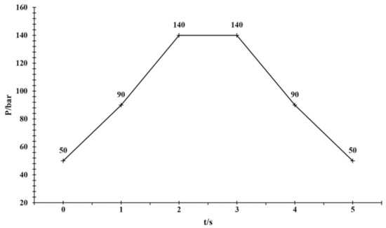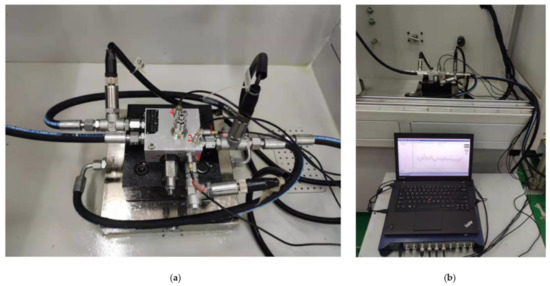 As shown in Figure 8, the waterproof valve fault test bench mainly included the tested valve part, shown in Figure 8a, and the vibration signal acquisition part shown in Figure 8b, and the power source part, which was provided by the hydraulic pump station. The waterproof valve was fixed on the valve test bench to eliminate the influence of pressure impacts of the pump or the vibration of the system itself. Four acceleration sensors (marked as 1, 2, 3 and 4 in the figure) were installed near port A, port 2, port K, and the back of the safety valve to collect vibration signals. The hydraulic pump set a pulse pressure to deliver to port A; its pulse pressure setting curve is shown in Figure 9. It can be seen from the curve that the pulse pressure was set as a cycle for 6 s and decreased after reaching the maximum pressure of 140 bar to simulate the on–off-overflow process of the overflow valve. The sampling frequency of each experiment was 6 kHz, and the duration was 10 min.