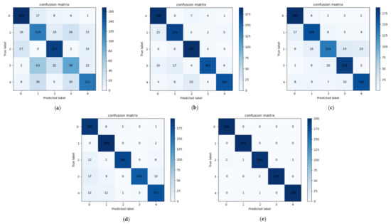 Confusion matrix for different methods: (a) SAE; (b) SDCAE; (c) EMDCNN; (d) EMDCNN–EMDCNN; (e) the proposed method.