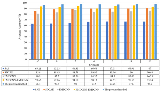 In order to conduct a fair comparison, the neural network models used for comparison were kept at as similar scale as possible, and were guaranteed to be the same as the optimizer of the proposed model; due to space limitations, we will not elaborate on the specific parameter settings in this paper. The compared networks were SAE, SDCAE, EMDCNN, and EMDCNN–EMDCNN.
