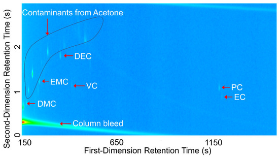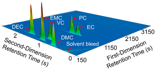 As shown in Figure 3, the minimum concentration of all the carbonate solvents, i.e., DMC, EMC, DEC, VC, PC, and EC, visually detected by the GC×GC/FID method was 0.2% at a signal to noise ratio of 50, corresponding to injections of 0.084, 0.080, 0.077, 0.110, 0.098, and 0.106 ppm in acetone for DMC, EMC, DEC, VC, PC, and EC, respectively.