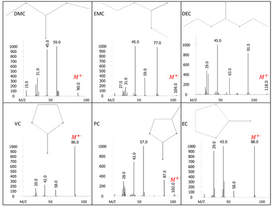 70 eV EI mass spectra obtained by using GC×GC/EI TOF MS for DMC, EMC, DEC, VC, PC, and EC.