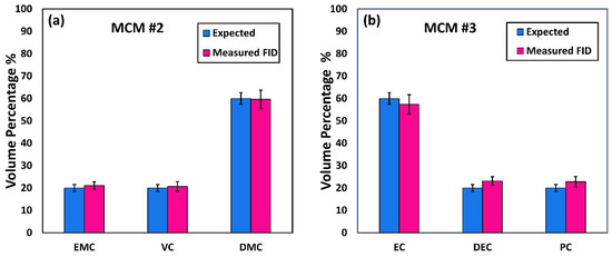 Expected and measured volume percentages of carbonates in MCM #2 (a) and MCM #3 (b) determined with GC×GC/FID.