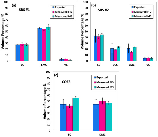 The compositions determined for SBSs and COES are shown in Figure 6. The errors in the expected volume percentages of the electrolytes in SBS #2 (which was prepared with a commercially obtained electrolyte solution as described in the experimental section) and the COES were especially large because of large uncertainties mentioned in the product specifications from the manufacturer. Both methods were very accurate. The percentage errors of the GC×GC/FID method for EC, EMC, and VC in SPS #1 were 0.8, 1.0, and 0.4%, respectively (average percentage error = 0.8%). The percentage errors of the GC×GC/FID method for EC, DEC, EMC, and VC in SPS #2 were 1.2, 2.0, 6.4, and 0.3%, respectively (average percentage error = 2.5%). The percentage errors of the GC×GC/FID method for EC and DMC in COES were 2.5 and 5.7%, respectively (average percentage error = 4.1%). The percentage errors of the GC×GC/EI TOF MS method for EC, EMC, and VC in SPS #1 were 0.2, 2.4, and 1.9%, respectively (average percentage error = 1.5%). The percentage errors of the GC×GC/EI TOF MS method for EC, DEC, EMC, and VC in SPS #2 were 1.8, 2.9, 2.6, and 0.2%, respectively (average percentage error = 1.9%). The percentage errors of the GC×GC/EI TOF MS method for EC and DMC in COES were 11 and 2%, respectively (average percentage error = 6.5%). Furthermore, the maximum uncertainty associated with the measurements using GC×GC/FID was 5.5% for DMC in COES (average uncertainty = 2.43%), and the maximum uncertainty of the measurements using GC×GC/EI TOF MS was 4.4% for EMC in SBS #1 (average uncertainty = 2.13%).