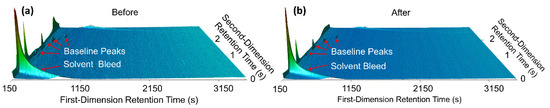 GC×GC/FID chromatograms of salt-containing samples: (a) COES and (b) SBS #2.