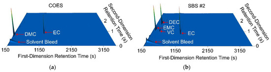 As shown in Figure 8, no additional column bleeding or changes in retention times or peak shapes were observed for COES or SBS #2, which further suggests that the effects of the LiPF6 salt were negligible. This is likely because very little salt was introduced into the instrument (samples were diluted 1000-fold prior to analysis, and only 0.1 µL of the diluted samples was analyzed). Additionally, inlet liners with glass wool were used at the inlet of the GC×GC instruments to trap nonvolatile compounds, such as LiPF6, and the liners were replaced when needed.