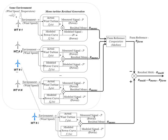 - The multi-turbine residual fault indicator is then calculated for each turbine as the difference between the mono Residual and Reference using Equation (3).