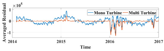 Figure 3 presents the examples of mono-turbine residual calculated using Method 1, presented in Section 2.2.1, and the residual calculated using the multi-turbine approach presented so far. The moving average of 1 week is calculated for both signals presented. The example presented shows fault-free data for the years 2014–2015 and a signal containing a fault induced in the year 2016. The fault used in the example is detailed in Section 4.3; Figure 7.