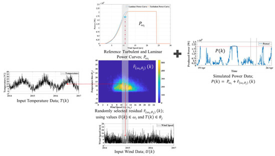 Figure 4 overviews the simulation process and the approach taken for incorporating the wind variability. To simulate a 10-min power time series, the simulation process is used with the wind speed and external temperature time series measured on a wind turbine as inputs. are times series of wind speeds and temperatures recorded every 10 min where is the time index.