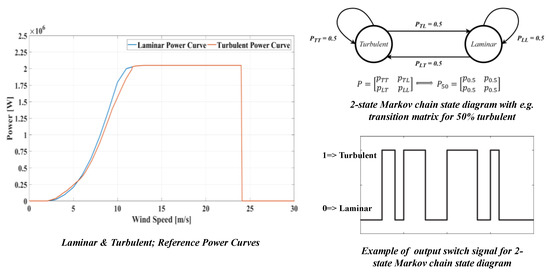 Figure 5 shows the laminar and turbulent power curves. Additionally, in the Markov chain state diagram, the transition matrix for the 50% turbulent wind scenario and an example of the output switch signal are also presented.
