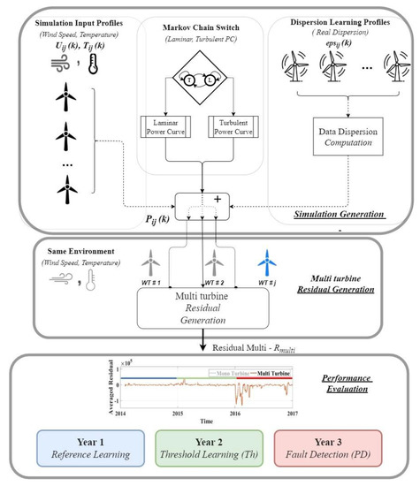References [23,24,25,26], however, tried to improve the prediction of the produced power by including potential sources of dispersion and variability as an input to the model. On the contrary, to avoid the difficulty caused by residual variability, some methods like [27,28,29] do not use residuals. Instead, these methods build models on two sets of data (historic and current or online and offline) and compare the models instead, to calculate a comparison constant as a fault indicator [15].