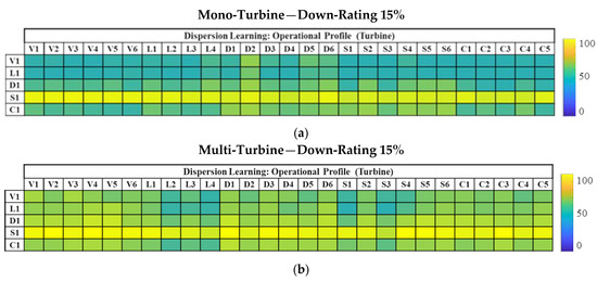 Figure 9b shows the matrix calculated for the Down-Rating 15% fault case using Method 1 in the ‘hybrid multi’ implementation. The color scale for this result is consistent with that used earlier (Blue-Green-Yellow). At a first glance, it is clearly visible from the much lighter shades as compared to Figure 9a that globally, the detection performance of Method 1 in the ‘hybrid multi’ configuration is significantly higher for all the farms tested. This gain is quantified at around 16 percentage points (pp.) for Down-Rating 15% and will be reported later along with the mean detection values for both approaches and their 95% confidence intervals.