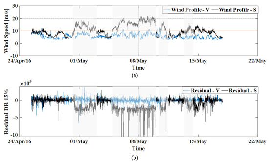 Comparison of Farm V and Farm S over 1 month period (a) Wind profiles with red line showing the 10 m/s mark (Periods with high wind speed on Farm S are highlighted gray) (b) Residual for Method 1- ‘mono’ for Down-Rating of 15% (Significantly higher activation of fault signature for Farm S is highlighted gray).