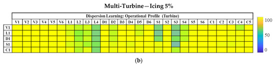 Similarly, for better visual representation, the PEM for fault type Icing in both scenarios (mono and hybrid multi) is useful. The indicators calculated for the Icing 5% fault case using Method 1 in ‘mono-turbine’ implementation are shown in Figure 11a. The three-level color scale goes from blue to green to yellow for absolute values (0–100) and is consistent with the previous implementation. It can be seen from the bluish-green shades that globally, the detection performance of Method 1 is low for all farms tested with a few exceptions.