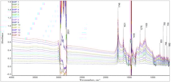 - Model C—the model was determined on the basis of mean absorbance values calculated in five wavenumber ranges, i.e., <1000 cm−1, 1000–1450 cm−1, 1475–1800 cm−1, 1800–2830 cm−1, and 2975–4000 cm−1. The indicated wavenumber ranges help identify any structural changes in the chemical structure of engine oil and the changes in background intensity. What is more, the fingerprint region of the spectrum below 1000 cm−1 was analyzed separately. As mentioned above, the calculations did not take into account the noise ranges occurring as a result of the generation of the differential spectrum.