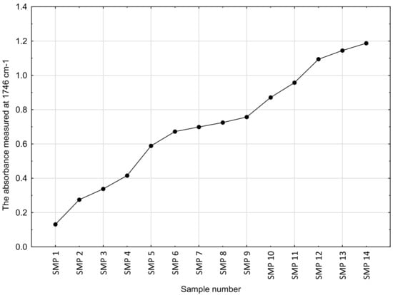 - Model D—the model was based on the signal absorbance extremes at the wavenumbers corresponding to the molecular structures in chemical compounds that affect the base number value of the engine oil, i.e., 1746 cm−1 (carbonyls), 1631 cm−1 (nitro compounds), 1196 cm−1, 1169 cm−1, and 1062 cm−1 (sulfones and sulfonates).