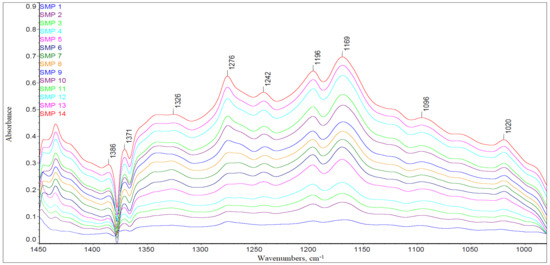 - Model A—the model was built on the basis of average absorbance values calculated in four wavenumber ranges of the same width, i.e., <1000 cm−1, 1000–2000 cm−1, 2000–3000 cm−1, and >3000 cm−1.