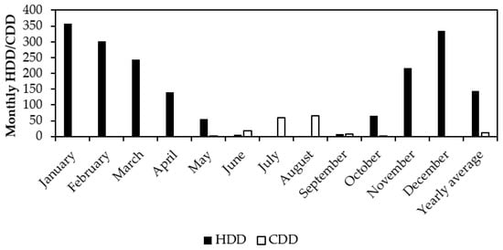 Figure 3, which presents the monthly heating and cooling degree days over a year based on Eurostat data from Barcelona between 2011 and 2020 [
