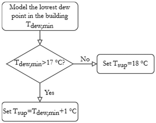 44]. During the unoccupied time, the cooling system is shut down, and the room temperature is allowed to drift. The control principle of the supply water temperature to the cooling panels is presented in
