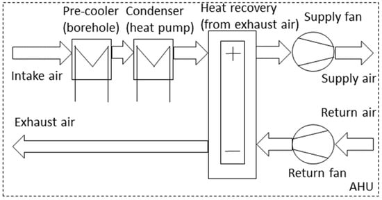 23], the condensate water is removed, and the supply air is finally reheated to 15 °C before it is delivered to the conditioned zone to avoid discomfort due to cold draught. The cooling is supplied using the geothermal cooling system complimented by a heat pump, and the reheating is done using heat recovery from the exhaust air. The use of heat pump for the condenser is necessary, as the temperature of the water coming from the ground heat exchanger is too high to sufficiently cool the supply air for moisture to condensate. A heat pump will be installed in the site for heating use, so utilising it as the cooling source is a practical solution. Other cooling sources could be used to reach similar performance. A schematic description of the system is presented in
