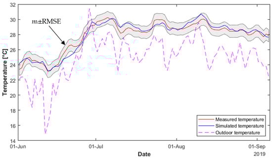 Figure 6. To confirm the validity of the model, the coefficient of variation of the root mean square error (CV(RMSE)) is calculated using hourly measurement and simulation data. The formula for CV(RMSE) is given in Equation (1):