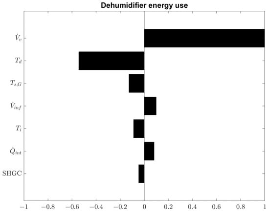 The results show that solar heat gain coefficient and indoor temperature setpoint are the most important input parameters for PMV and operative temperature. This indicates that a significant part of the cooling load is caused by solar radiation coming through the windows, even as the windows are equipped with polyvinyl chloride (PVC) shutters to reduce direct radiation. The most significant parameters for indoor relative humidity are the dehumidifier temperature setpoint and air infiltration through the building envelope. The dehumidifier temperature setpoint determines the humidity of supply air entering the building: a lower dehumidification temperature results in a higher latent cooling load removal rate. Infiltration through the building envelope allows humid outdoor air to pass into the building untreated, which leads to a higher latent cooling load. The most significant parameters for thermal energy use in the cooling panels are internal heat gains and solar heat gain coefficient, i.e., the two studied input parameters directly linked to the sensible cooling load of the building. Finally, the most significant variables for the dehumidifier energy use are the ventilation flow rate and the dehumidifier temperature setpoint. A higher flow rate requires more outdoor air to be treated, resulting in higher energy use. In contrast, low dehumidification temperature means a higher portion of the latent load per unit of supply air is removed, thus requiring more energy. The results are quantified in