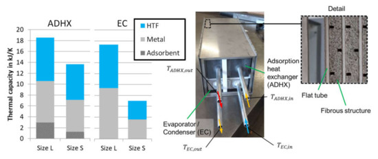 - Gluesenkamp, K.R.; Frazzica, A.; Velte, A.; Metcalf, S.; Yang, Z.; Rouhani, M.; Blackman, C.; Qu, M.; Laurenz, E.; Rivero-Pacho, A.; et al. Experimentally Measured Thermal Masses of Adsorption Heat Exchangers. Energies 2020, 13, 1150. [Google Scholar] [CrossRef] [Green Version]
