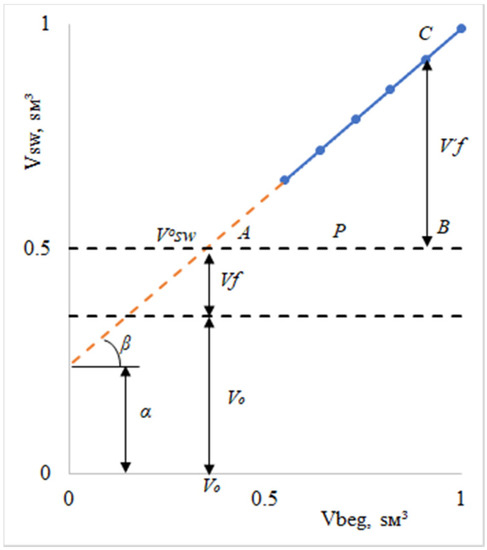 The volume of the swollen sample Vsw at any value of the initial volume of the dry sample Vbeg is equal to the sum of the volumes, Equation (7) (see Figure 2):