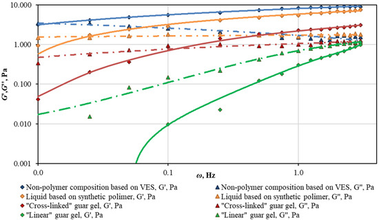 As can be seen from the results in the “linear” guar gel the viscosity modulus prevails over the elastic modulus over the entire frequency range. Compositions based on “cross-linked” guar gel, VES, and synthetic polymers have different frequency dependencies for the elasticity and viscosity modulus. In the low-frequency region, the value of G″ is higher than the value of G′ and the compositions exhibit viscous fluid properties. However, in the high-frequency range the behavior of the curve’s changes and the value of G′ increases and reaches a plateau while the values of G′ for compositions based on VES and PHPA are significantly higher than for the “cross-linked” guar gel (at 2.0 Hz, the G′ values are about 6.0 and 8.0 Pa for the compositions PolyGel and VES, respectively, while for the “cross-linked” gel the G′ value is 2.7 Pa). At the same time, with increasing frequency the value of viscosity parameter G″ is significantly reduced.