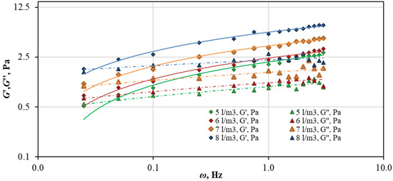 Oscillatory rheology quantifies the assessment of both the viscous and elastic properties of a material. Oscillation studies were carried out on a rotary rheometer GRACE M5600. In this type of research, the magnitude of the moment of the forces applied to the rotor changes according to the harmonic law. In this experiment, the frequency was varied in the range from 0.01 to 3.0 Hz at a fixed voltage amplitude. During measurements, the test sample is minimally deformed, which allows for a more detailed and accurate assessment of the properties of the test sample. In oscillatory studies, the frequency dependencies of such parameters as the modulus of accumulation (elasticity, G′) and the modulus of losses (viscosity, G″) are determined [46,55,56,63,64,65,66].
