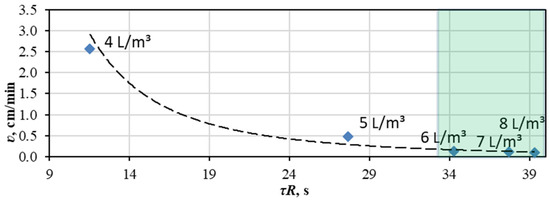 Figure 5 shows the dependence of the proppant settling rate on the relaxation time. There is a dependence that with an increase in the relaxation time, the proppant settling rate decreases. For the studied synthetic polymer solution, it was noticed that at a dosage of 6 L/m3 or more, the system achieves the best values of the sand-holding capacity index, which corresponds to the highest values of the relaxation time. As a result, the relaxation time can act as a criterion for selecting the concentration of the gelling agent.