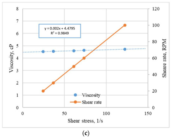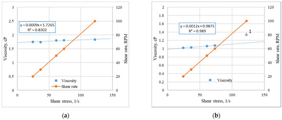 where is the shear stress in Pa; is the consistency coefficient in mPa·s; is the shear rate in s−1; n is the flow behavior index. In turn, the effective viscosity (μ) of such systems is determined by the following formula [60,61]: