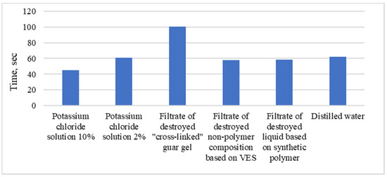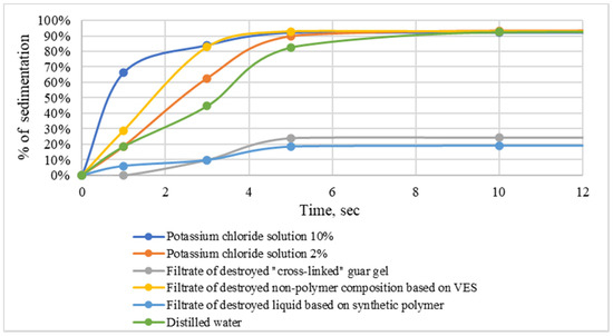 Further studies of the sand-carrying capacity of the investigated fracturing fluids (Table 2) showed that the systems based on VES and synthetic polymers are characterized by the ability to retain the proppant in its volume comparable to the highly viscous “cross-linked” guar gel. These results can be explained by the high indices of the elastic modulus of these systems as shown by oscillatory rheology.